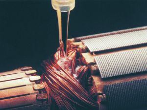В производстве современных электрических машин и аппаратов основное применение нашли термореактивные пропиточные составы, которые при нагреве твердеют в результате сшивания молекул. После отверждения при высокой температуре (160-200±С) они приобретают стабильные электрическиеи механические свойства, мало изменяющиеся при нагревании.